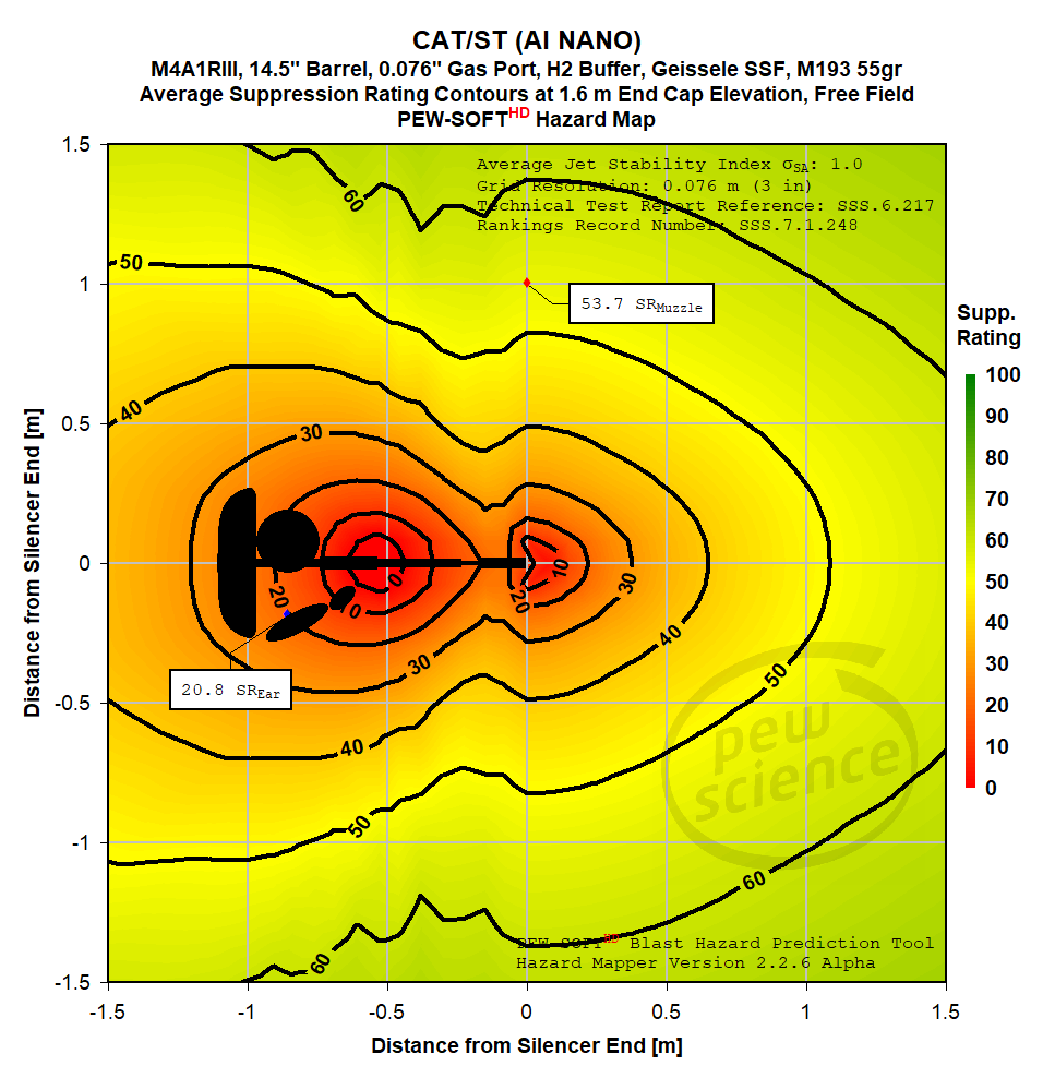 This Silencer Hazard Map Brief documents the free field blast overpressure hazards from the CAT ST silencer fielded on the 14.5-in M4A1RIII AR-15 semiautomatic rifle firing M193 55gr 5.56 NATO ammunition, as evaluated in technical Report 6.217 and as tabulated in record number 7.1.248 in the Rankings.