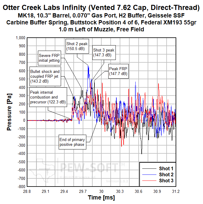 The testing and analysis presented in this Sound Signature Review are of the Otter Creek Labs Infinity with three different end caps on the MK18 Automatic AR15 rifle rifle, chambered in 5.56x45mm NATO with a 10.3-inch barrel. Federal XM193 55gr ammunition was used in the test. The standard PEW Science MK18 test host weapon system is described in Public Research Supplement 6.51.