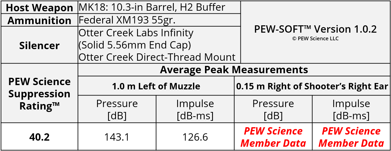 PEW Science is an independent private testing laboratory and also hosts the world’s only independent public suppressed small arms research cooperative. Testing, data analysis, and reporting is generated with funding provided by PEW Science members. Any test data that is generated with any portion of private funding contains this disclosure. The testing and analysis production for this Sound Signature Review was funded in part by PEW Science Project PEW-OCL-103-001-24. Therefore, data pertaining to the Infinity in this Sound Signature Review is published with the express written permission of Otter Creek Labs, LLC