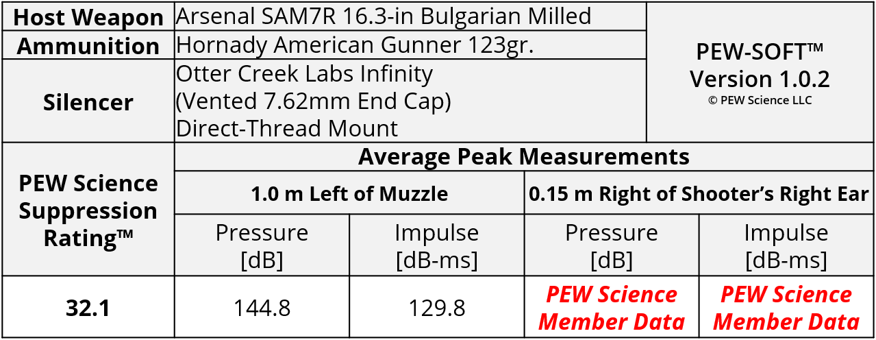 With this report, the PEW Science Silencer Sound Standard continues 7.62x39mm AK-pattern rifle silencer performance evaluation. The test data and analysis herein covers the Otter Creek Labs Infinity equipped with its vented 7.62 end cap evaluated on two Bulgarian-pattern AK platform rifles with 16.3-in and 12.6-in barrels, respectively. This specific configuration of the Infinity silencer has also been evaluated in the following reports: