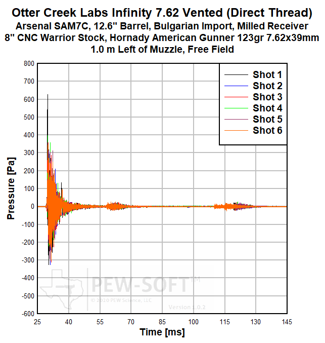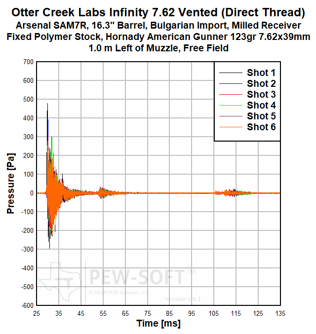 Real sound pressure histories from a 6-shot test acquired with PEW-SOFT™ are shown below. Six cartridges were loaded into the magazine, the fire control group positioned to single-shot, and the weapon was fired until the magazine was empty. Only five shots are considered in the analysis. The signatures of Shot 6 are displayed in the data presentation but are not included in the analysis to maintain consistency with the overall PEW Science public dataset and bolt-closing signatures. The waveforms are not averaged, decimated, or filtered. The data acquisition rate used in all PEW Science laboratory sound signature testing is 1.0 MS/s (1 MHz). The peaks, shape, and time phasing (when the peaks occur in relation to absolute time and to each other) of these raw waveforms are the most accurate of any firearm silencer testing publicly available. PEW-SOFT data is acquired by PEW Science independent laboratory testing; the recognized industry leader in silencer sound research. For more information, please consult the Silencer Sound Standard.