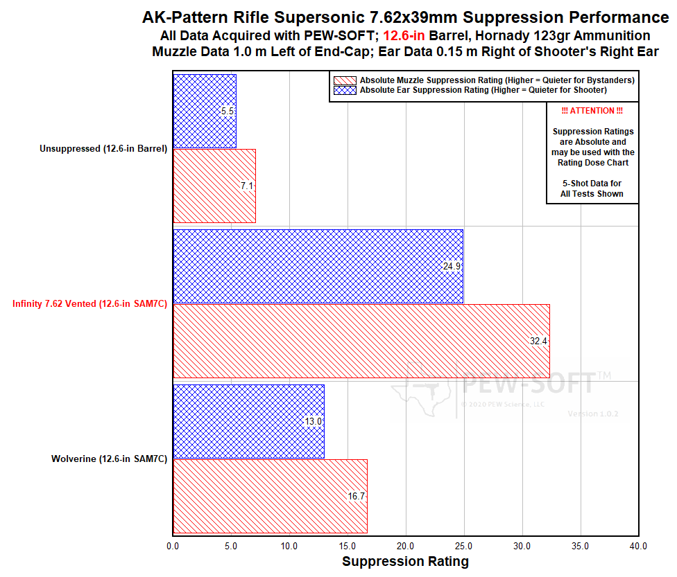 Figure 2. Suppression Rating Comparisons of Otter Creek Labs Infinity Vented and Dead Air Wolverine Using PEW-SOFT 7.62×39mm Supersonic 12.6-in barrel AK Test Data and PEW Science Analysis