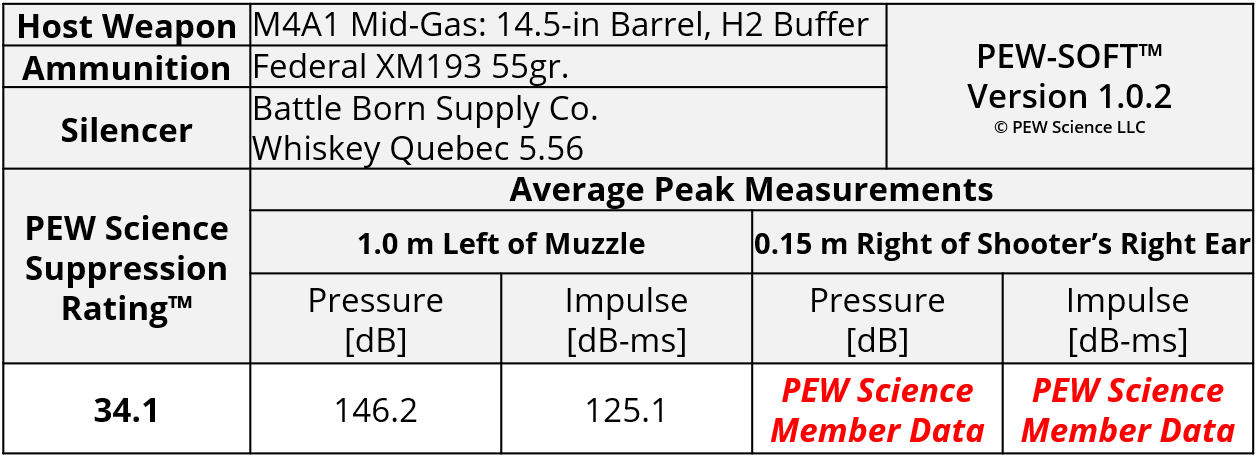 PEW Science is an independent private testing laboratory and also hosts the world’s only independent public suppressed small arms research cooperative. Testing, data analysis, and reporting is generated with funding provided by PEW Science members. Any test data that is generated with any portion of private funding contains this disclosure. The testing and analysis production for this Sound Signature Review was funded in part by PEW Science Project PEW-BBS-123-001-25. Therefore, data pertaining to the Whiskey Quebec 5.56 in this Sound Signature Review is published with the express written permission of Battle Born Supply Co.