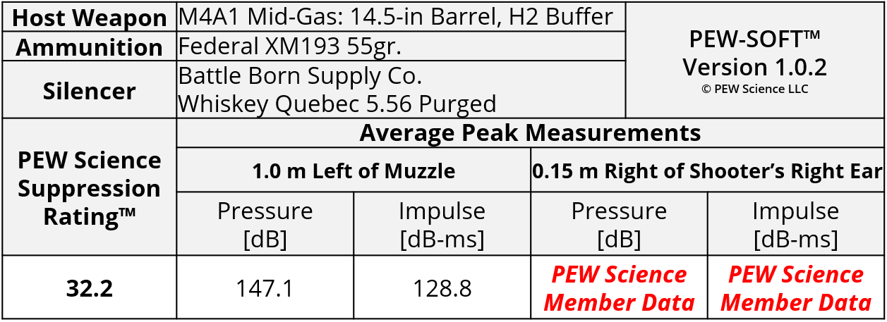 PEW Science is an independent private testing laboratory and also hosts the world’s only independent public suppressed small arms research cooperative. Testing, data analysis, and reporting is generated with funding provided by PEW Science members. Any test data that is generated with any portion of private funding contains this disclosure. The testing and analysis production for this Sound Signature Review was funded in part by PEW Science Project PEW-BBS-123-001-25. Therefore, data pertaining to the Whiskey Quebec 5.56 Purged in this Sound Signature Review is published with the express written permission of Battle Born Supply Co.