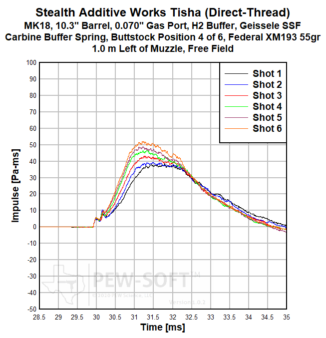 In this review, the Stealth Additive Works Tisha performance metrics depend upon suppressing a supersonic centerfire rifle cartridge on a short barrel gas-operated rifle, which is an incredibly difficult task. PEW Science encourages the reader to remain vigilant with regard to all supersonic centerfire rifle suppression claims. The gas volume and combustion products created by the firing of the supersonic 5.56x45mm cartridge are significant; the measured pressure and impulse magnitudes, and their durations, illustrate this fact. Silencer performance on automatic (reciprocating) rifles depends on many factors. Weapon configuration may significantly influence total suppressed small arm system performance.