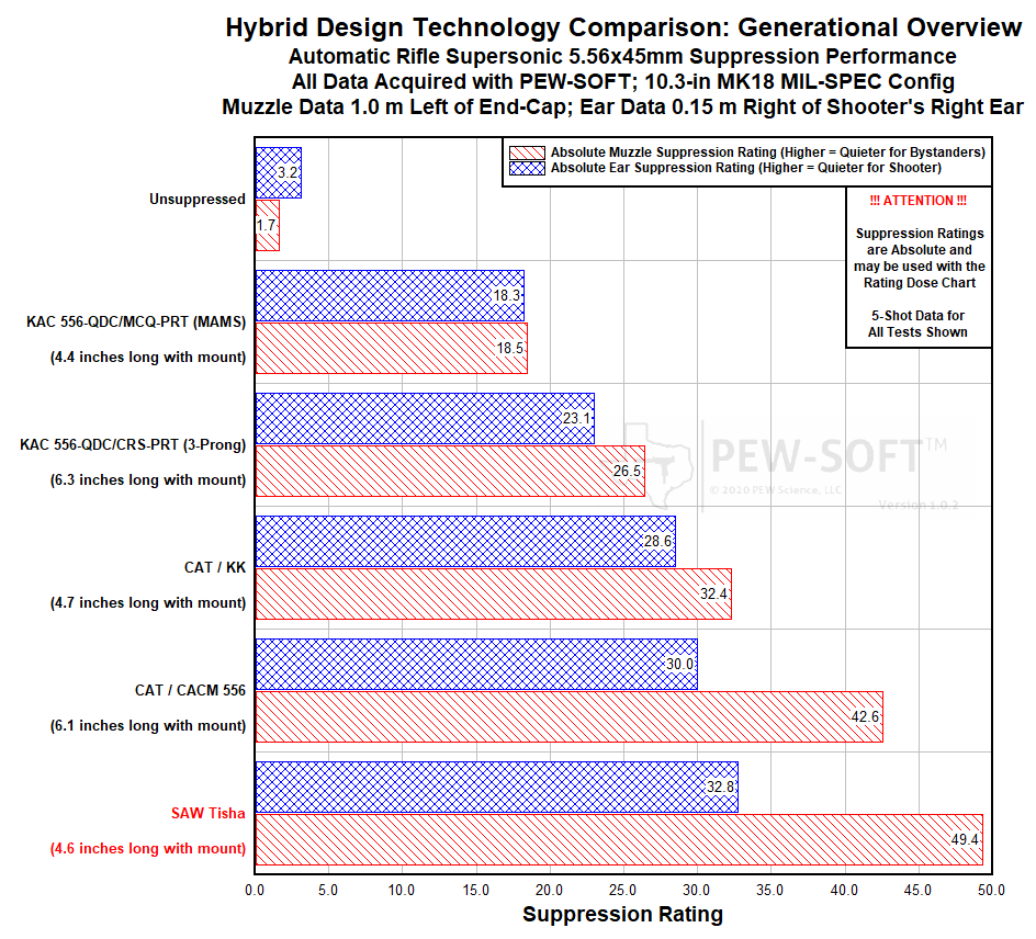 Figure 1. Suppression Rating Comparisons of Stealth Additive Works, CAT SURGE BYPASS, and KAC PRT Technologies Using PEW-SOFT 5.56x45mm Supersonic MK18 Test Data and PEW Science Analysis