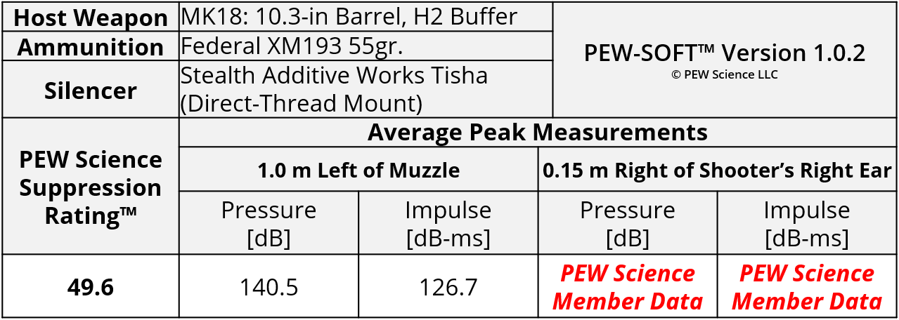PEW Science is an independent private testing laboratory and also hosts the world’s only independent public suppressed small arms research cooperative. Testing, data analysis, and reporting is generated with funding provided by PEW Science members. Any test data that is generated with any portion of private funding contains this disclosure. The testing and analysis production for this Sound Signature Review was funded in part by PEW Science Project PEW-SAW-134-001-25. Therefore, data pertaining to the Tisha in this Sound Signature Review is published with the express written permission of Stealth Additive Works.