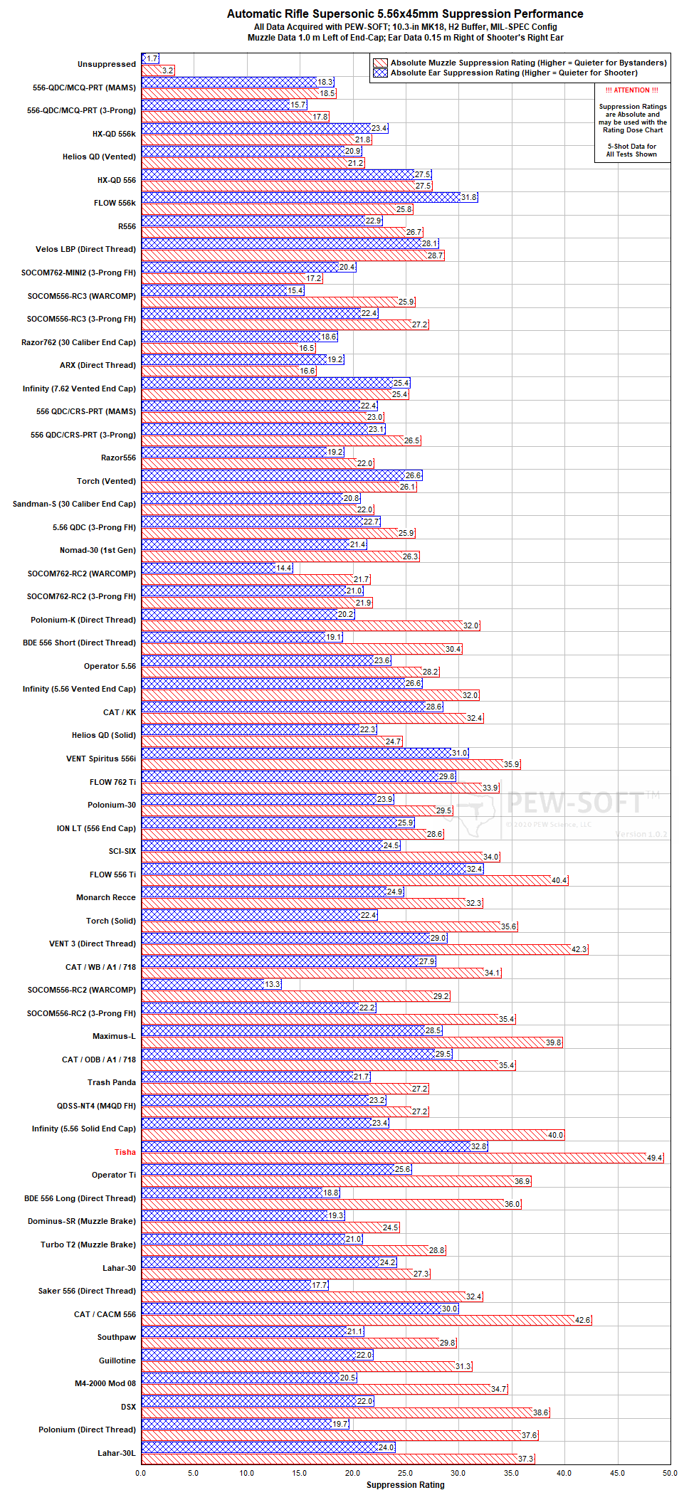 Figure 6. Suppression Rating Comparisons of the Stealth Additive Works Tisha and other rifle silencers, Using PEW-SOFT 5.56x45mm Supersonic Test Data and PEW Science Analysis