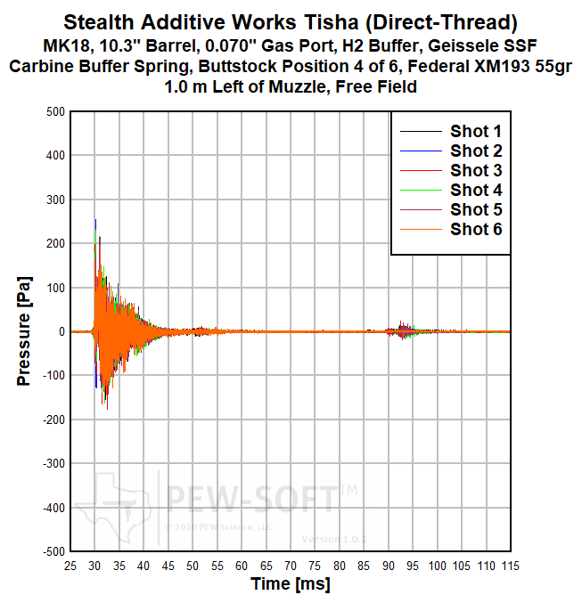 Real sound pressure histories from a 6-shot test acquired with PEW-SOFT™ are shown below. Six cartridges were loaded into the magazine, the fire control group positioned to single-shot, and the weapon was fired until the magazine was empty and the bolt locked back on the follower of the empty magazine. Only five shots are considered in the analysis. The signatures of Shot 6 are displayed in the data presentation but are not included in the analysis to maintain consistency with the overall PEW Science public dataset and bolt-closing signatures. The waveforms are not averaged, decimated, or filtered. The data acquisition rate used in all PEW Science laboratory sound signature testing is 1.0 MS/s (1 MHz). The peaks, shape, and time phasing (when the peaks occur in relation to absolute time and to each other) of these raw waveforms are the most accurate of any firearm silencer testing publicly available. PEW-SOFT data is acquired by PEW Science independent laboratory testing; the recognized industry leader in silencer sound research. For more information, please consult the Silencer Sound Standard.