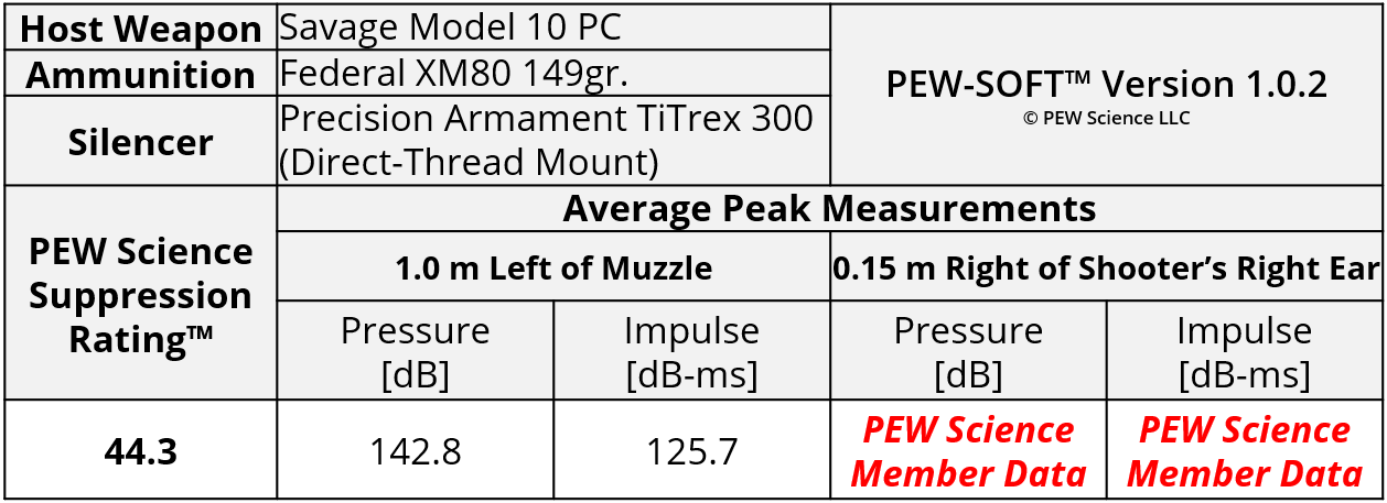 PEW Science is an independent private testing laboratory and also hosts the world’s only independent public suppressed small arms research cooperative. Testing, data analysis, and reporting is generated with funding provided by PEW Science members. Any test data that is generated with any portion of private funding contains this disclosure. The testing and analysis production for this Sound Signature Review was funded in part by PEW Science Project PEW-PA-133-001-25. Therefore, data pertaining to the TiTrex 300 in this Sound Signature Review is published with the express written permission of Precision Armament.