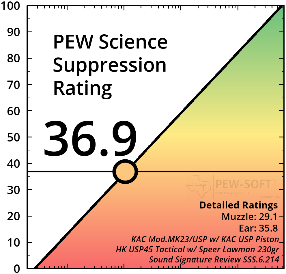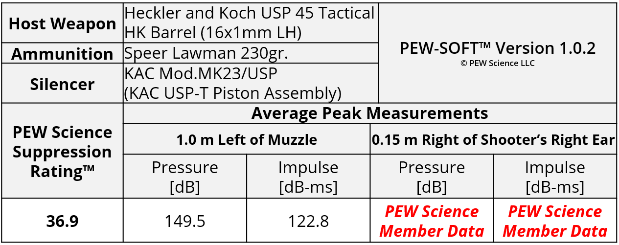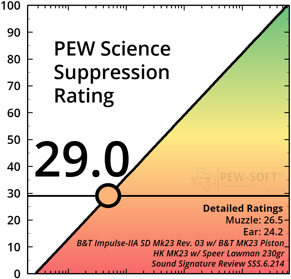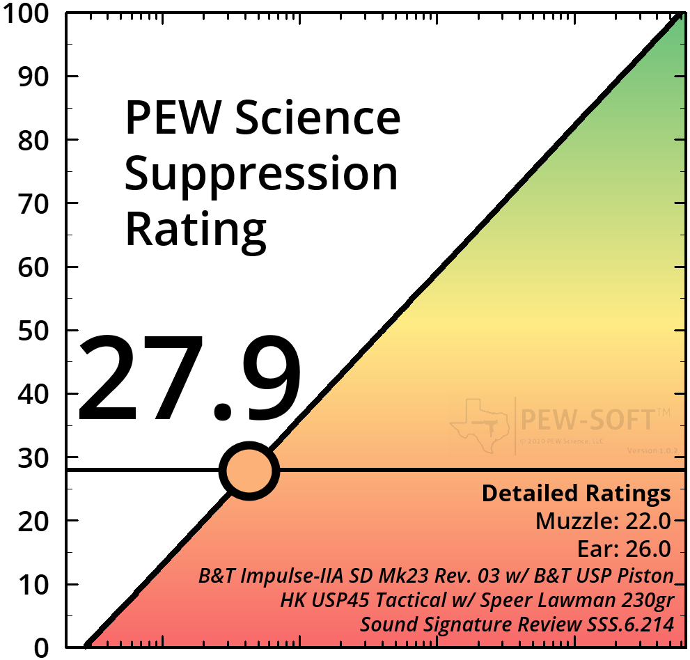 When paired with the HK USP45 Tactical full-size semiautomatic pistol and fired with Speer Lawman 230gr ammunition, the KAC MOD.MK23 / USP achieved a Suppression Rating™ of 36.9 in PEW Science testing. The B&T Impulse-IIA SD Mk23 Rev. 03 with the same host weapon and the same ammunition achieved a Suppression Rating of 27.9.