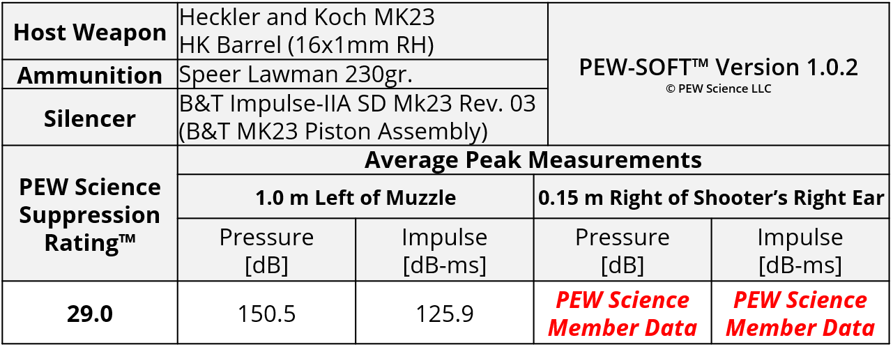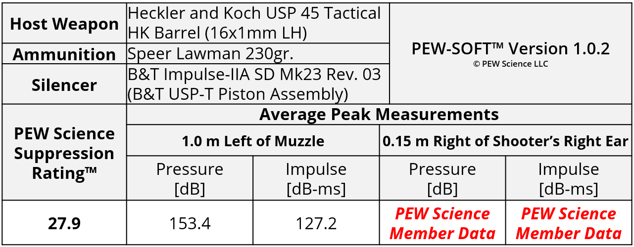 A summary of the principal Silencer Sound Standard performance metrics of the B&T Impulse-IIA SD Mk23 Rev. 03 tested on the HK MK23 is shown in Table 2. The data acquired 1.0 m (39.4 in) left of the muzzle is available for viewing to all. The data acquired 0.15 m (6 in) right of the shooter’s ear is only available to membership supporters of PEW Science and the Silencer Sound Standard. You can support public PEW Science testing, research, and development with a membership, here. State-of-the-art public firearm sound signature testing and research conducted by PEW Science is supported by readers like you.