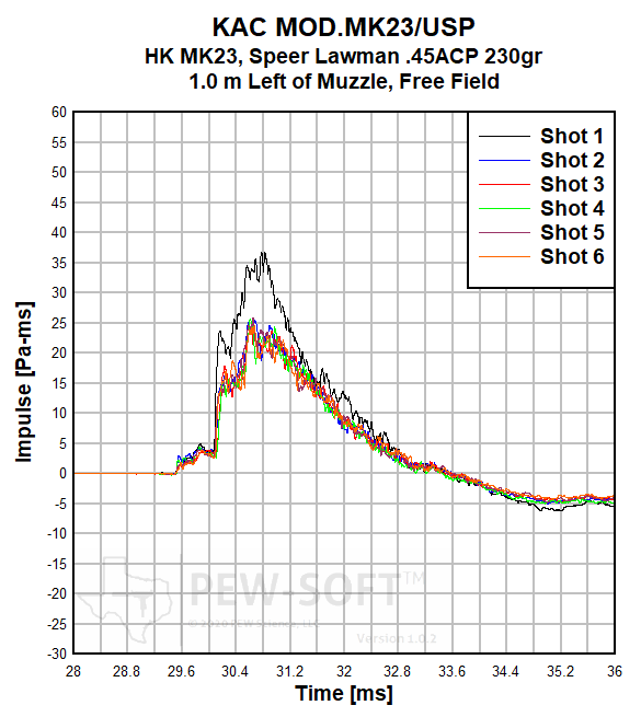 The primary sound signature pressure histories for all 6 shots with the KAC MOD.MK23/USP tested on the HK USP45 Tactical are shown in Figure 12. The real sound impulse (momentum transfer potential) histories from the same 6-shot test are shown in Figure 13.