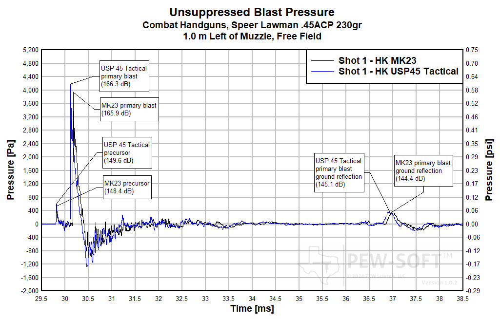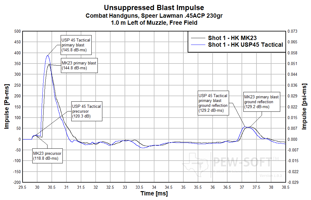 Fig 2. Unsuppressed muzzle Blast Pressure from the HK MK23 and USP45 Tactical full-size semiautomatic pistols measured by PEW Science with PEW-SOFT