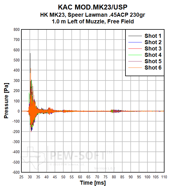 Real sound pressure histories from a 6-shot test acquired with PEW-SOFT™ are shown below. Six cartridges were loaded into the magazine and the weapon was fired until the magazine was empty, and the slide locked back on the slide-release lever actuated by the follower of the empty magazine. Only five shots are considered in the analysis. The signatures of Shot 6 are displayed in the data presentation but are not included in the analysis to maintain consistency with the overall PEW Science dataset. The waveforms are not averaged, decimated, or filtered. The data acquisition rate used in all PEW Science testing is 1.0 MS/s (1 MHz). The peaks, shape, and time phasing (when the peaks occur in relation to absolute time and to each other) of these raw waveforms are the most accurate of any firearm silencer testing publicly available. PEW-SOFT data is acquired by PEW Science independent testing; the industry leader in silencer sound research. For more information, please consult the Silencer Sound Standard.