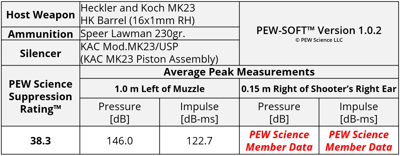 When paired with the HK MK23 full-size semiautomatic pistol and fired with Speer Lawman 230gr ammunition, the KAC MOD.MK23 / USP achieved a Suppression Rating™ of 38.3 in PEW Science testing. The B&T Impulse-IIA SD Mk23 Rev. 03 with the same host weapon and the same ammunition achieved a Suppression Rating of 29.0.