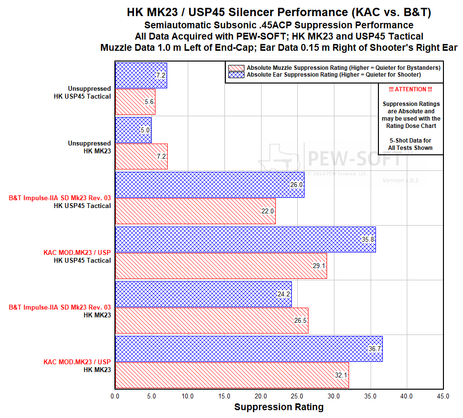Fig 20. Suppression Rating Comparisons of KAC MOD.MK23/USP and B&T Impulse-IIA SD Mk23 Rev. 03 silencers on the HK MK23 and USP45 Tactical full-size semiautomatic pistols Using PEW-SOFT Test Data and PEW Science Analysis