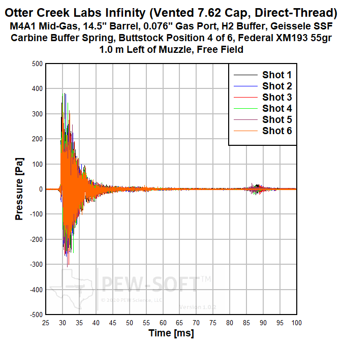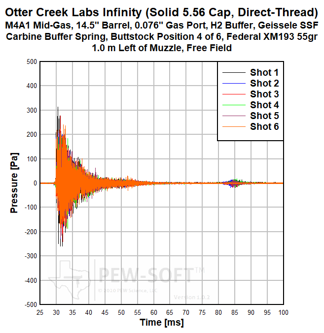 Real sound pressure histories from a 6-shot test acquired with PEW-SOFT™ are shown below. Six cartridges were loaded into the magazine, the fire control group positioned to single-shot, and the weapon was fired until the magazine was empty and the bolt locked back on the follower of the empty magazine. Only five shots are considered in the analysis. The signatures of Shot 6 are displayed in the data presentation but are not included in the analysis to maintain consistency with the overall PEW Science public dataset and bolt-closing signatures. The waveforms are not averaged, decimated, or filtered. The data acquisition rate used in all PEW Science laboratory sound signature testing is 1.0 MS/s (1 MHz). The peaks, shape, and time phasing (when the peaks occur in relation to absolute time and to each other) of these raw waveforms are the most accurate of any firearm silencer testing publicly available. PEW-SOFT data is acquired by PEW Science independent laboratory testing; the recognized industry leader in silencer sound research. For more information, please consult the Silencer Sound Standard.
