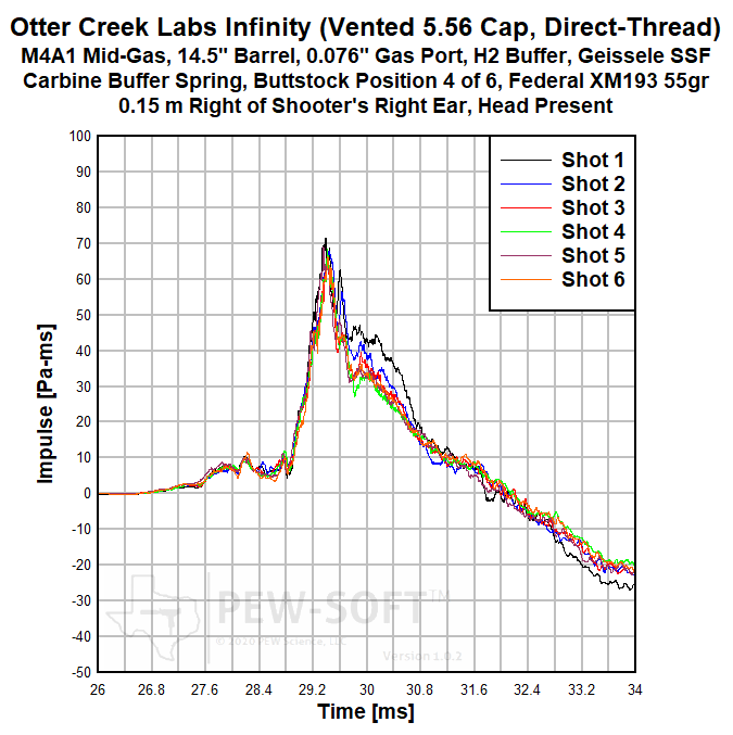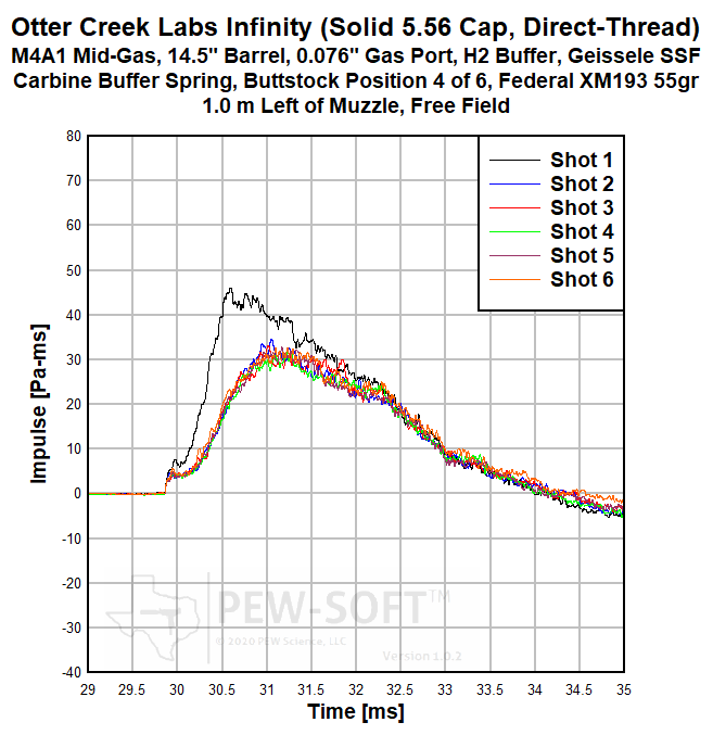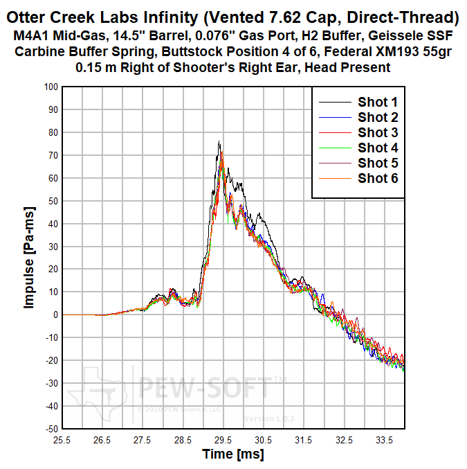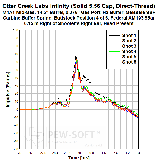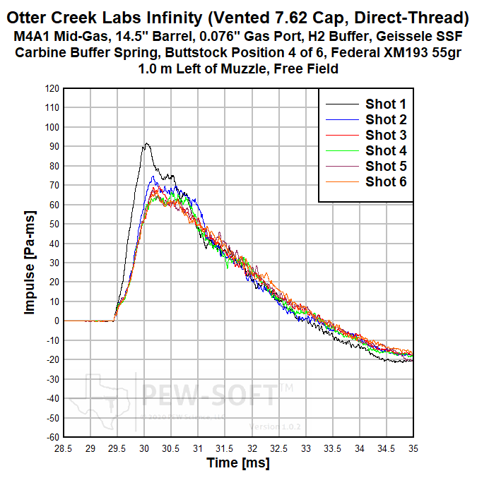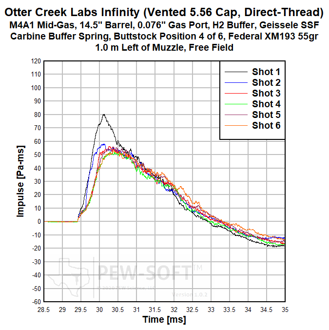 The primary sound signature pressure histories for all 6 shots with the Otter Creek Labs Infinity with solid 5.56 end cap are shown in Figure 2a. The sound signatures of Shot 1 and Shot 2 are shown in Figure 1b, in early time. The real sound impulse (momentum transfer potential) histories from the same 6-shot test are shown in Figure 3a. In Figure 3b, a shorter timescale is shown comparing the impulse of Shot 1 to that of Shots 2 and 3.