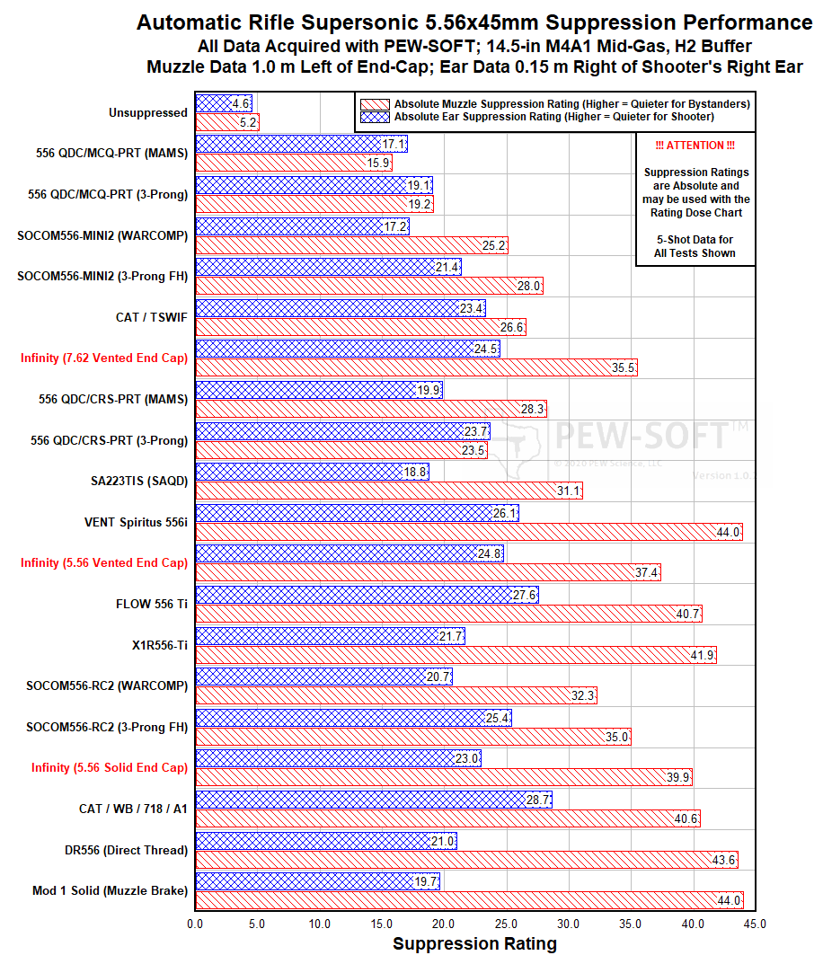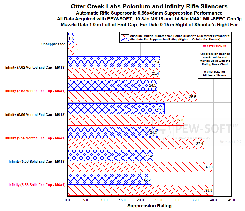 Figure 1. Suppression Rating Comparisons of Otter Creek Labs Infinity Using PEW-SOFT 5.56x45mm Supersonic MK18 and M4A1 Test Data and PEW Science Analysis