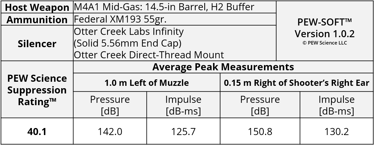 A summary of the principal Silencer Sound Standard performance metrics of the Otter Creek Labs Infinity with solid 5.56 end cap is shown in Table 1. The data acquired 1.0 m (39.4 in) left of the muzzle is available for viewing to all. This is a members-only review and includes pressure and impulse waveforms measured at the shooter’s ear. PEW Science thanks you for your support; further testing, research, and development of PEW-SOFT and the Silencer Sound Standard is made possible by members like you!