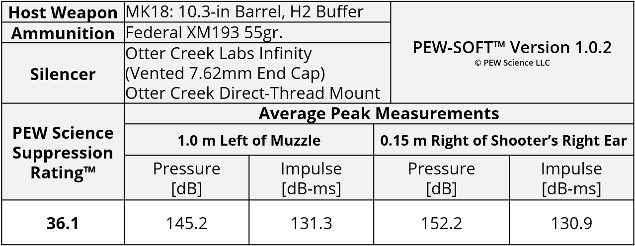 PEW Science is an independent private testing laboratory and also hosts the world’s only independent public suppressed small arms research cooperative. Testing, data analysis, and reporting is generated with funding provided by PEW Science members. Any test data that is generated with any portion of private funding contains this disclosure. The testing and analysis production for this Sound Signature Review was funded in part by PEW Science Project PEW-OCL-121-001-25. Therefore, data pertaining to the Infinity in this Sound Signature Review is published with the express written permission of Otter Creek Labs, LLC