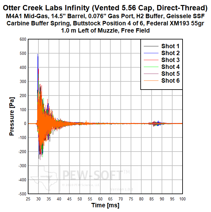 PEW Science Research Note 1: As discussed in the previous MK18 test report, the Infinity represents a large step forward in the Otter Creek Labs design pedigree. When fitted with the solid 5.56 end cap, the Otter Creek Labs Infinity functions as a 30 caliber rifle silencer with a high early-time flow rate and a restricted late-time flow rate. This performance is demonstrated by the following characteristics shown in the above test data (differences between MK18 and M4 data are shown in bold):