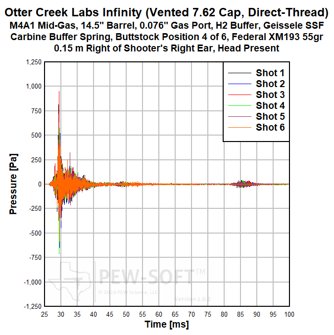Real sound pressure histories from the same 6-shot test acquired with PEW-SOFT at the shooter’s ear are shown below. Again, the waveforms are not averaged, decimated, or filtered. The data acquisition rate used in all PEW Science testing is 1.0 MS/s (1 MHz).