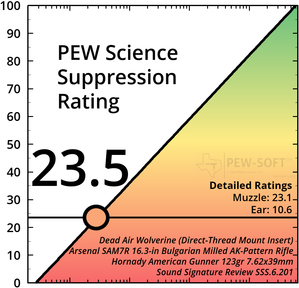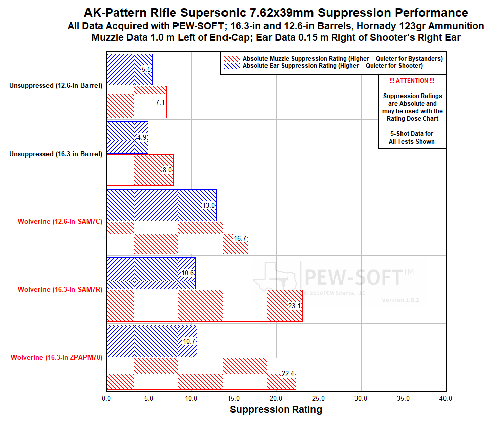 Figure 14. Suppression Rating Comparisons of Dead Air Wolverine Using PEW-SOFT 7.62×39mm Supersonic AK Test Data and PEW Science Analysis