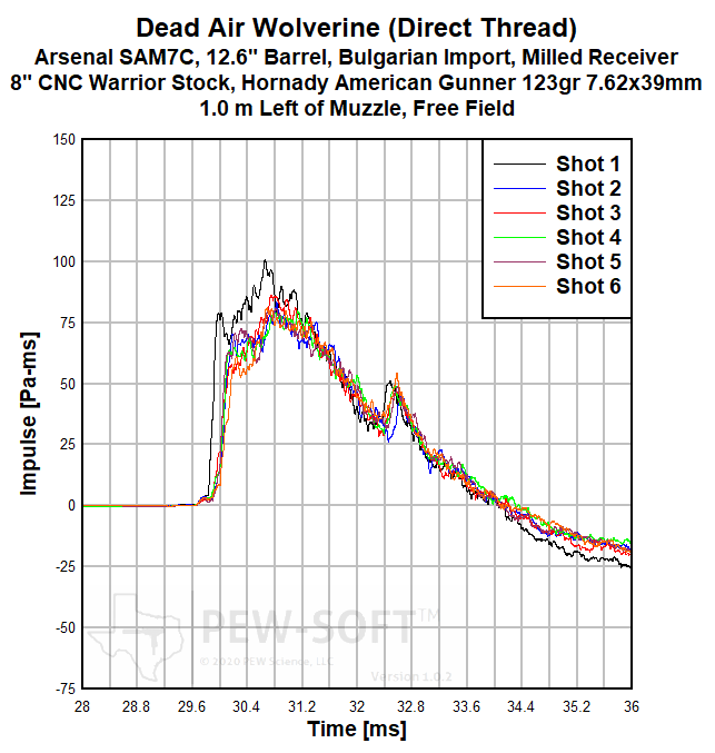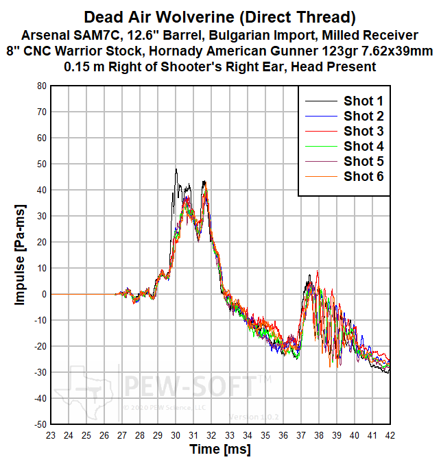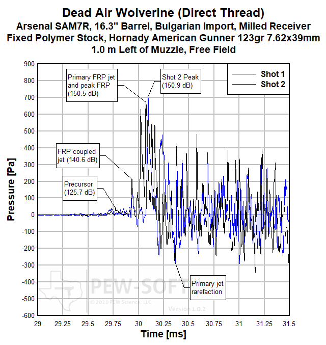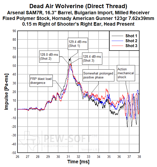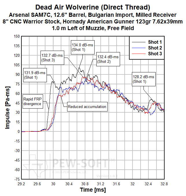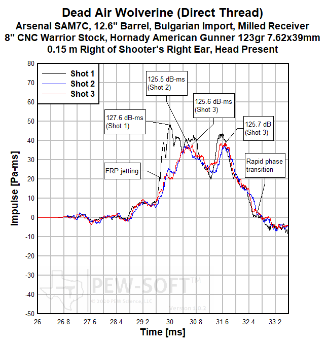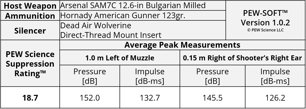 A summary of the principal Silencer Sound Standard performance metrics of the Dead Air Wolverine on the 12.6-in barrel Arsenal SAM7C Bulgarian AK-pattern rifle is shown in Table 3. The data acquired 1.0 m (39.4 in) left of the muzzle is available for viewing to all. This is a members-only review and includes pressure and impulse waveforms measured at the shooter’s ear. PEW Science thanks you for your support; further testing, research, and development of PEW-SOFT and the Silencer Sound Standard is made possible by members like you!