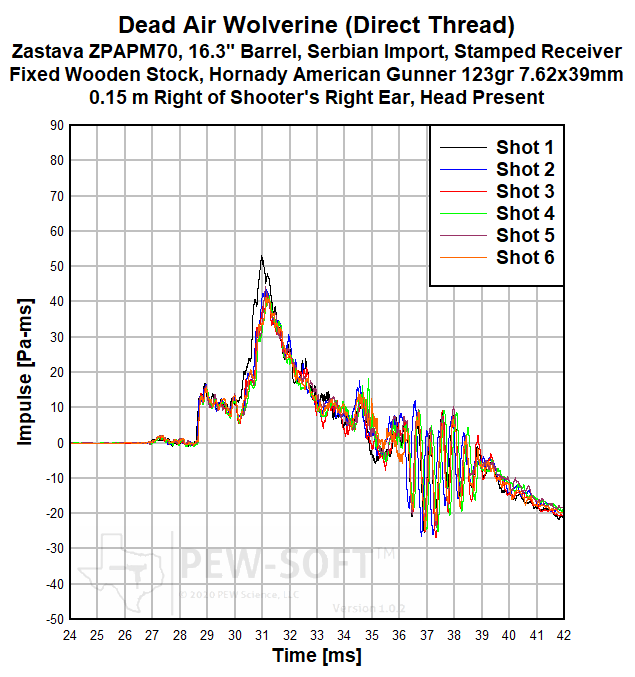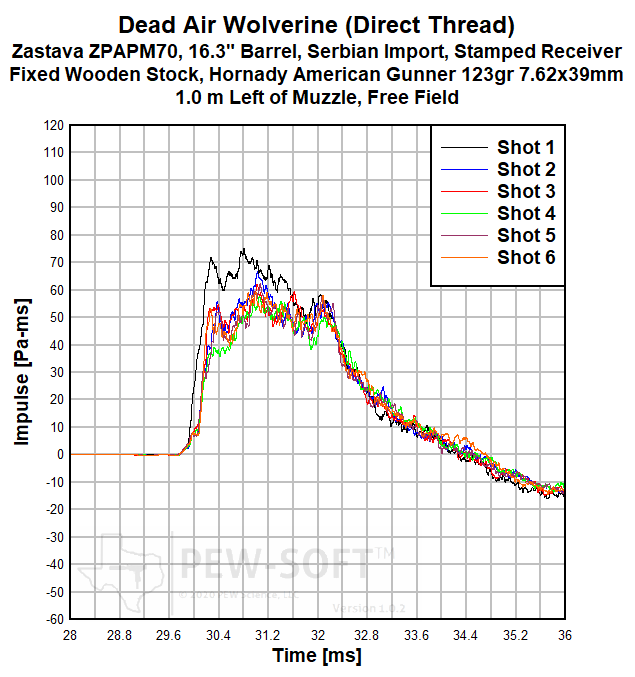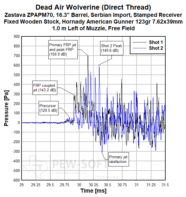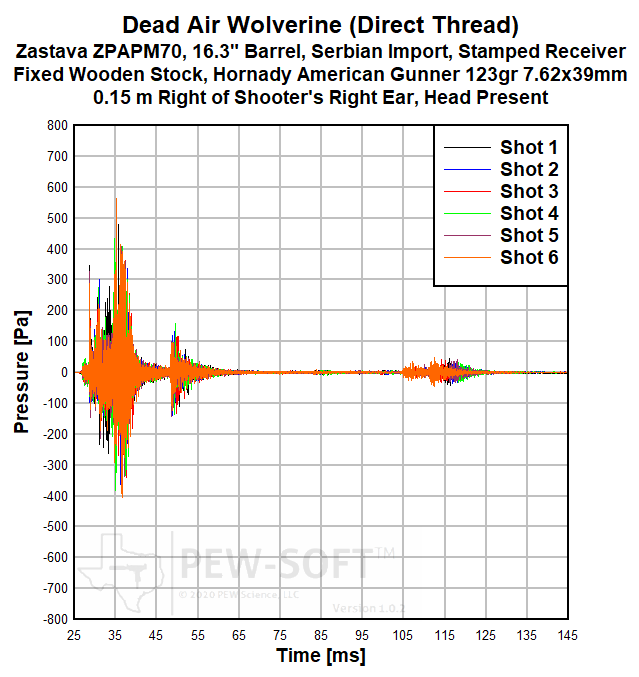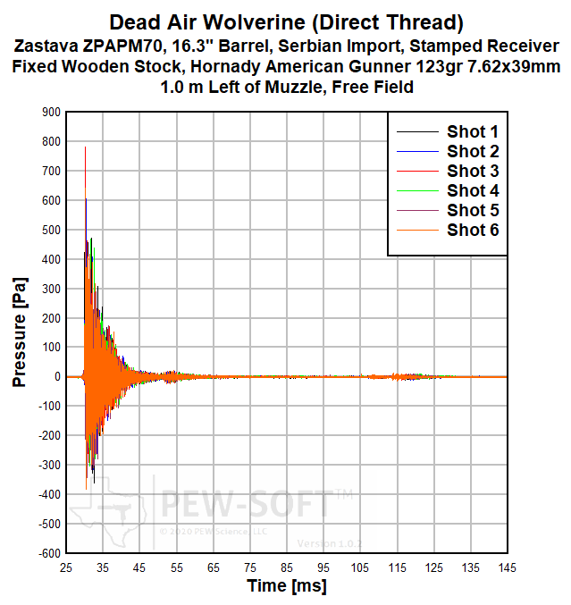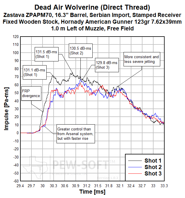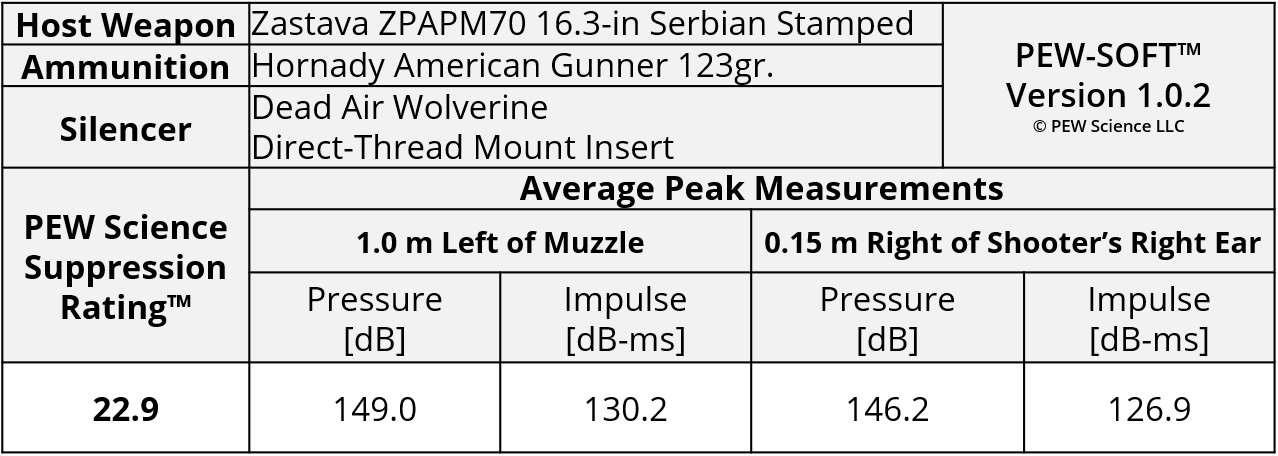 A summary of the principal Silencer Sound Standard performance metrics of the Dead Air Wolverine on the 16.3-in barrel Zastava ZPAPM70 Serbian (Yugoslavian) AK-pattern rifle is shown in Table 2. The data acquired 1.0 m (39.4 in) left of the muzzle is available for viewing to all. This is a members-only review and includes pressure and impulse waveforms measured at the shooter’s ear. PEW Science thanks you for your support; further testing, research, and development of PEW-SOFT and the Silencer Sound Standard is made possible by members like you!