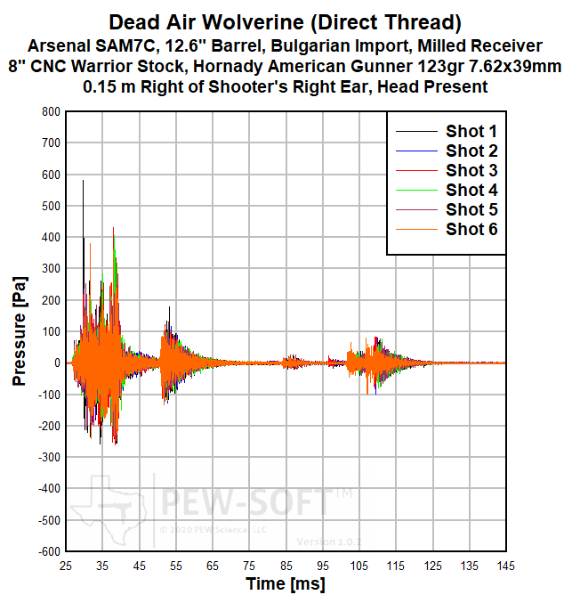 Real sound pressure histories from a 6-shot test acquired with PEW-SOFT™ are shown below. Six cartridges were loaded into the magazine, the fire control group positioned to single-shot, and the weapon was fired until the magazine was empty. Only five shots are considered in the analysis. The signatures of Shot 6 are displayed in the data presentation but are not included in the analysis to maintain consistency with the overall PEW Science public dataset and bolt-closing signatures. The waveforms are not averaged, decimated, or filtered. The data acquisition rate used in all PEW Science laboratory sound signature testing is 1.0 MS/s (1 MHz). The peaks, shape, and time phasing (when the peaks occur in relation to absolute time and to each other) of these raw waveforms are the most accurate of any firearm silencer testing publicly available. PEW-SOFT data is acquired by PEW Science independent laboratory testing; the recognized industry leader in silencer sound research. For more information, please consult the Silencer Sound Standard.