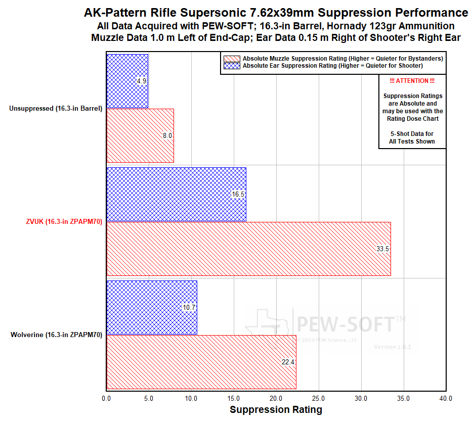 Figure 6. Suppression Rating Comparisons of Zastava ZVUK and Dead Air Wolverine Using PEW-SOFT 7.62×39mm Supersonic AK Test Data and PEW Science Analysis