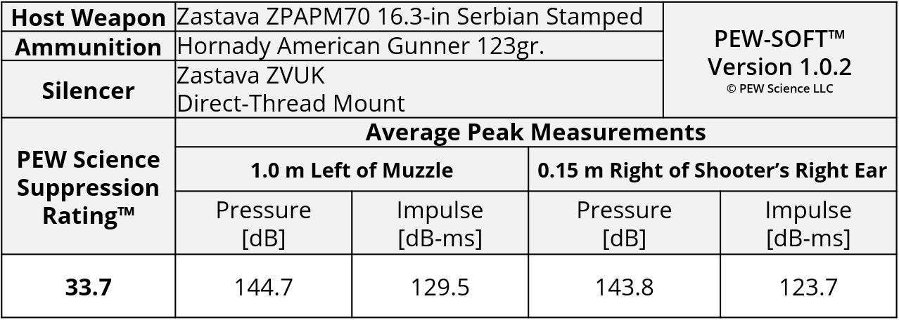 PEW Science is an independent private testing laboratory and also hosts the world’s only independent public suppressed small arms research cooperative. Testing, data analysis, and reporting is generated with funding provided by PEW Science members. Any test data that is generated with any portion of private funding contains this disclosure. The testing and analysis production for this Sound Signature Review was funded in part by PEW Science Project PEW-Zastava-118-001-25. Therefore, data pertaining to the ZVUK in this Sound Signature Review is published with the express written permission of Zastava Arms USA.