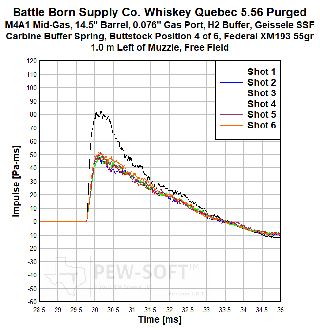 The primary sound signature pressure histories for all 6 shots with the Battle Born Supply Co. Whiskey Quebec 5.56 Purged are shown in Figure 1a. The sound signatures of Shot 1 and Shot 2 are shown in Figure 1b, in early time. The real sound impulse (momentum transfer potential) histories from the same 6-shot test are shown in Figure 2a. In Figure 2b, a shorter timescale is shown comparing the impulse of Shot 1 to that of Shot 2 and Shot 3.