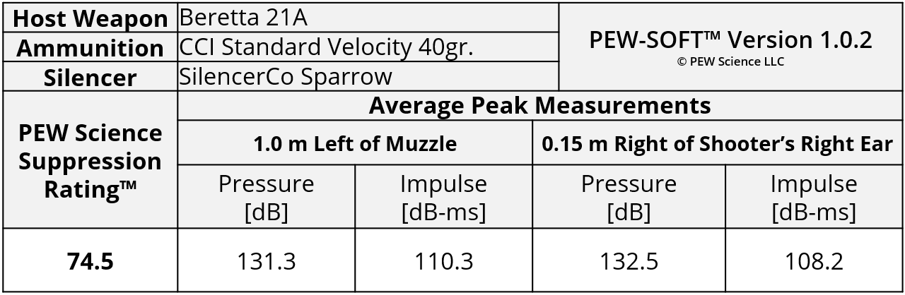A summary of the principal Silencer Sound Standard performance metrics of the SilencerCo Sparrow is shown in Table 1. The data acquired 1.0 m (39.4 in) left of the muzzle is available for viewing to all. This is a members-only review and includes pressure and impulse waveforms measured at the shooter’s ear. PEW Science thanks you for your support; further testing, research, and development of PEW-SOFT and the Silencer Sound Standard is made possible by members like you!