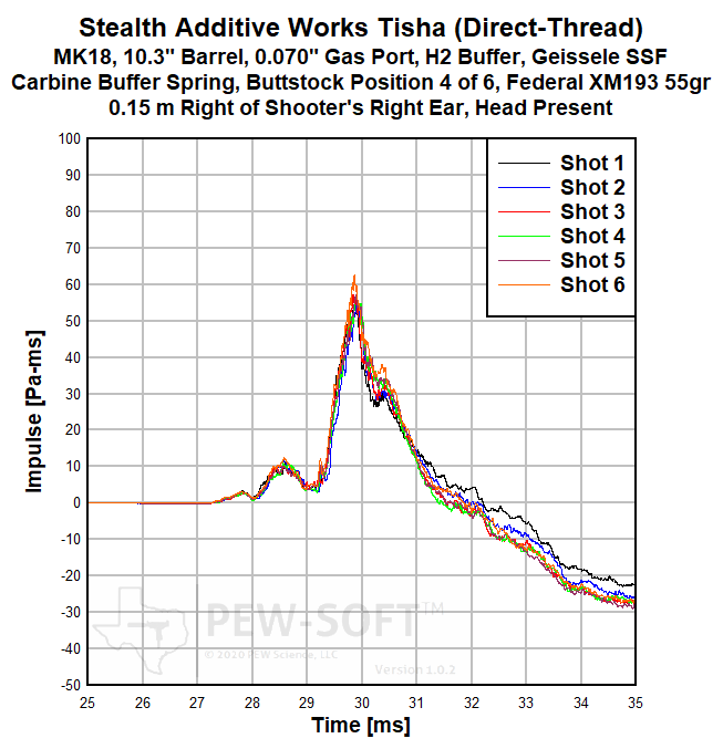 In this review, the Stealth Additive Works Tisha performance metrics depend upon suppressing a supersonic centerfire rifle cartridge on a short barrel gas-operated rifle, which is an incredibly difficult task. PEW Science encourages the reader to remain vigilant with regard to all supersonic centerfire rifle suppression claims. The gas volume and combustion products created by the firing of the supersonic 5.56x45mm cartridge are significant; the measured pressure and impulse magnitudes, and their durations, illustrate this fact. Silencer performance on automatic (reciprocating) rifles depends on many factors. Weapon configuration may significantly influence total suppressed small arm system performance.