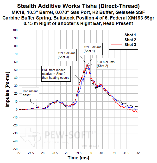 As typically indicated, first-round sound signatures always differ from subsequent shots, as the atmosphere within the silencer changes. The FRP phenomenon cannot always be shown by viewing only the peak sound pressure. This is one of the reasons why The Silencer Sound Standard requires examining multiple sound signature metrics. Ammunition consistency can play a role in the determination of FRP, however, the close examination of measured pressure and impulse waveforms typically excludes ammunition from the possible factors influencing true FRP, due to the relative consistency of most high quality factory ammunition.