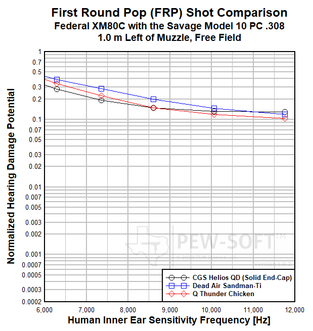 PEW Science Research Note: There is a high frequency bias noted at the muzzle during the FRP of the Helios QD that may be perceived by bystanders as higher-pitched but there is also a low frequency bias that may overwhelm that perception, depending on the hearing response capability of the individual bystander. After FRP, this bias is still present, but the Sandman-Ti will most likely still be perceived as louder than the Helios. After FRP, the Thunder Chicken will most likely be perceived by bystanders to be the quietest of the three silencers.