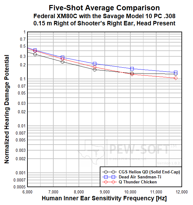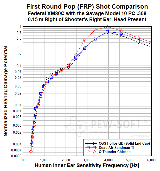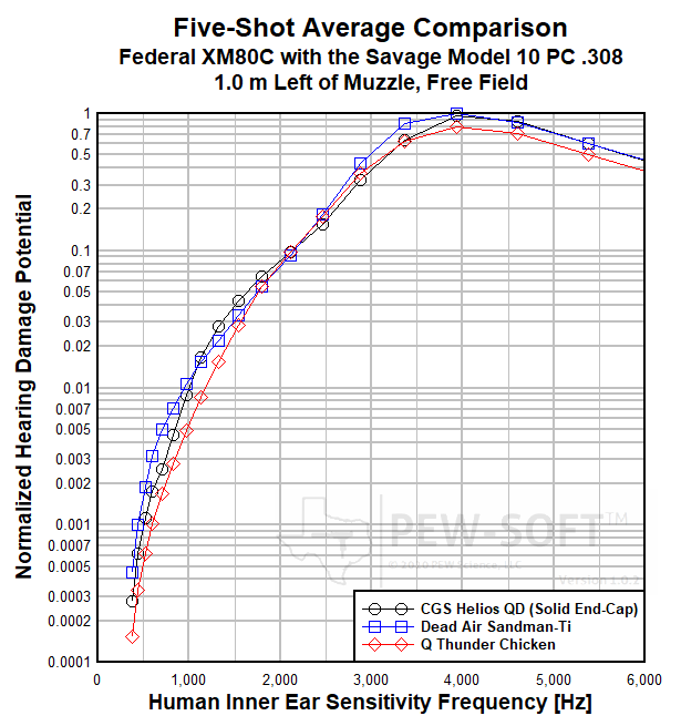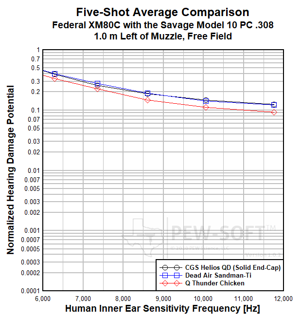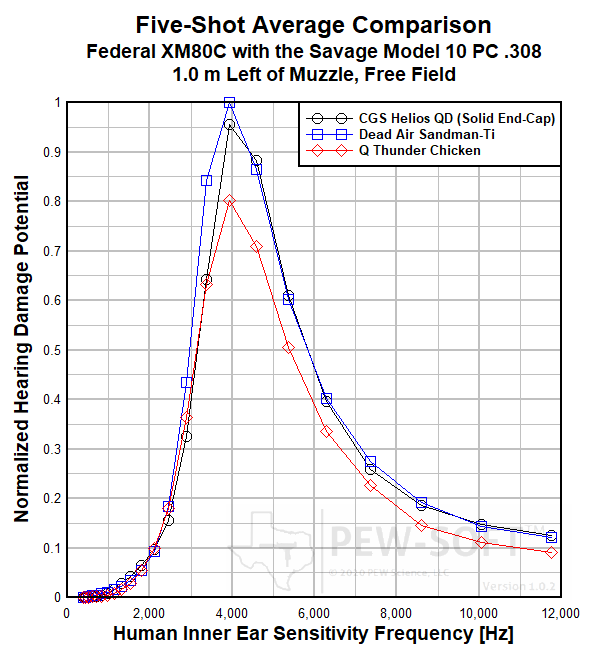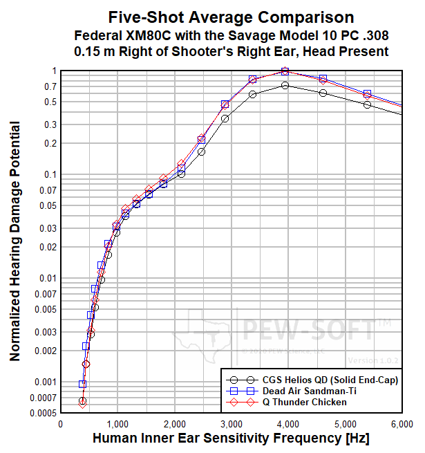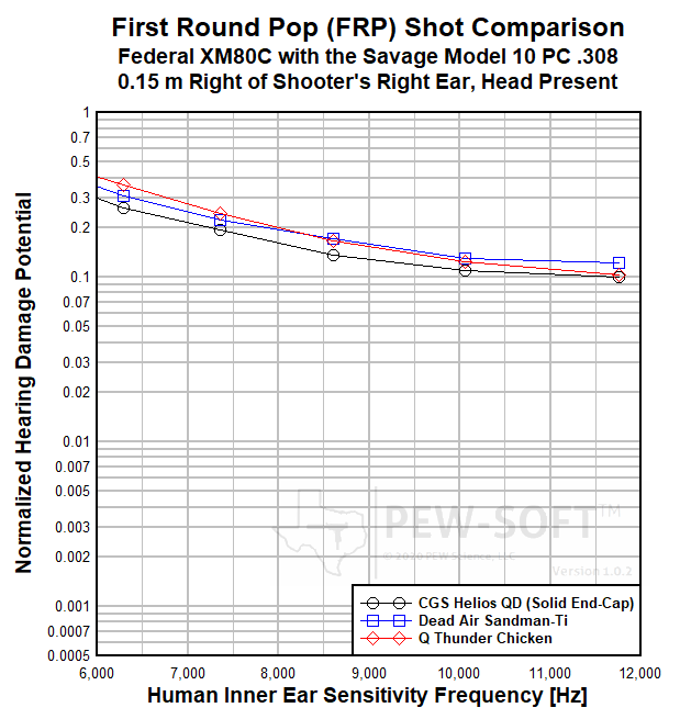 The previous Sound Signature Reviews of the CGS Helios QD (6.13), Dead Air Sandman-Ti (6.19), and Q Thunder Chicken (6.20) presented typical sound signatures of the silencers on a .308 bolt-action rifle with an 20-inch barrel. In PEW Science testing, the Helios QD achieved a Suppression Rating of 44.5. The Sandman-Ti achieved a rating of 41.5. The Thunder Chicken also achieved a rating of 41.5. Detailed muzzle and ear Suppression Ratings of the silencers are provided in the respective reviews.