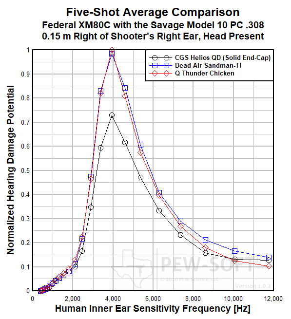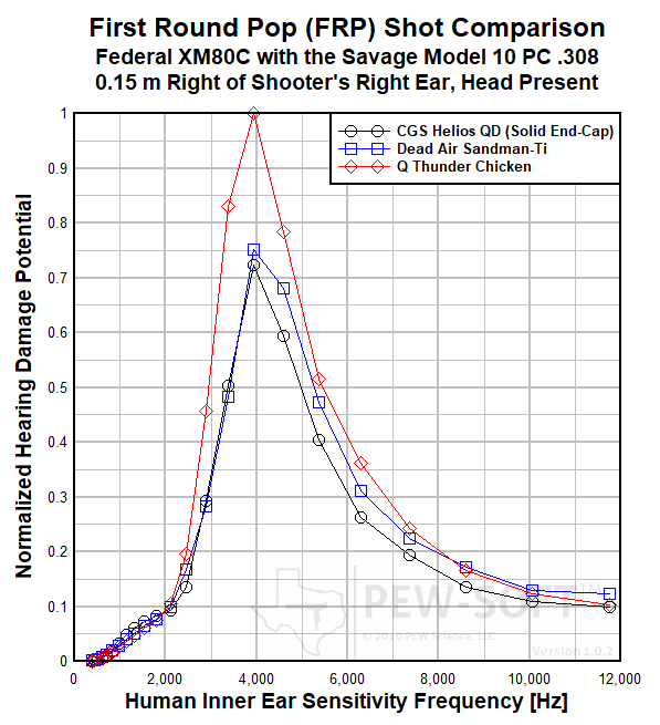 The Q Thunder Chicken exhibits superior muzzle performance (which correlates to bystander perception) on average, but the CGS Helios QD is superior in FRP at the muzzle. The Helios QD exhibits superior at-ear performance (which correlates to shooter perception) in both FRP and on average. The Dead Air Sandman-Ti is louder at the muzzle than the Thunder Chicken and the Helios QD, but has slightly better average at-ear performance than the Thunder Chicken, albeit with a higher pitch. The Helios QD earns the highest Suppression Rating overall, and seems to exhibit a “lower pitched” sound signature than the other two silencers during FRP, as shown in analytical human inner ear modeling.