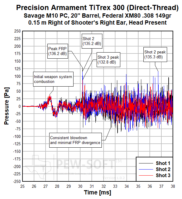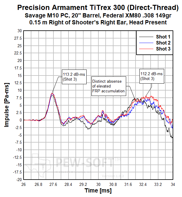PEW Science Research Note 2: The Precision Armament TiTrex 300 is an extremely optimized silencer with both FRP and gross signature suppression being a primary design driver. This is demonstrated in the measured performance. Personnel risk is not elevated during FRP with the TiTrex; it is effectively masked.
