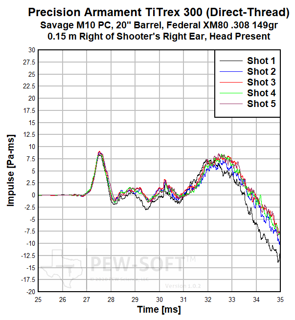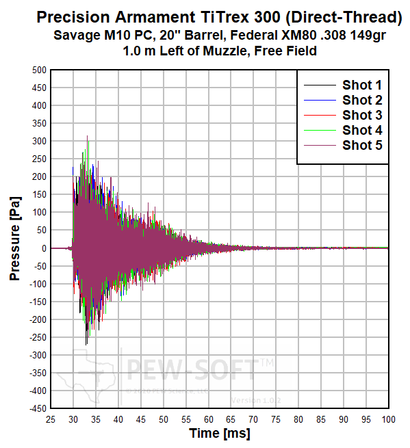 Real sound pressure histories from the same 5-shot test of the Precision Armament TiTrex 300 acquired with PEW-SOFT at the shooter’s ear are shown below. Again, the waveforms are not averaged, decimated, or filtered. The data acquisition rate used in all PEW Science testing is 1.0 MS/s (1 MHz).