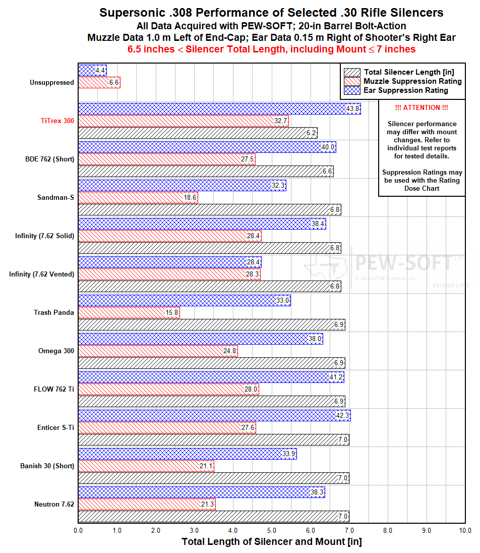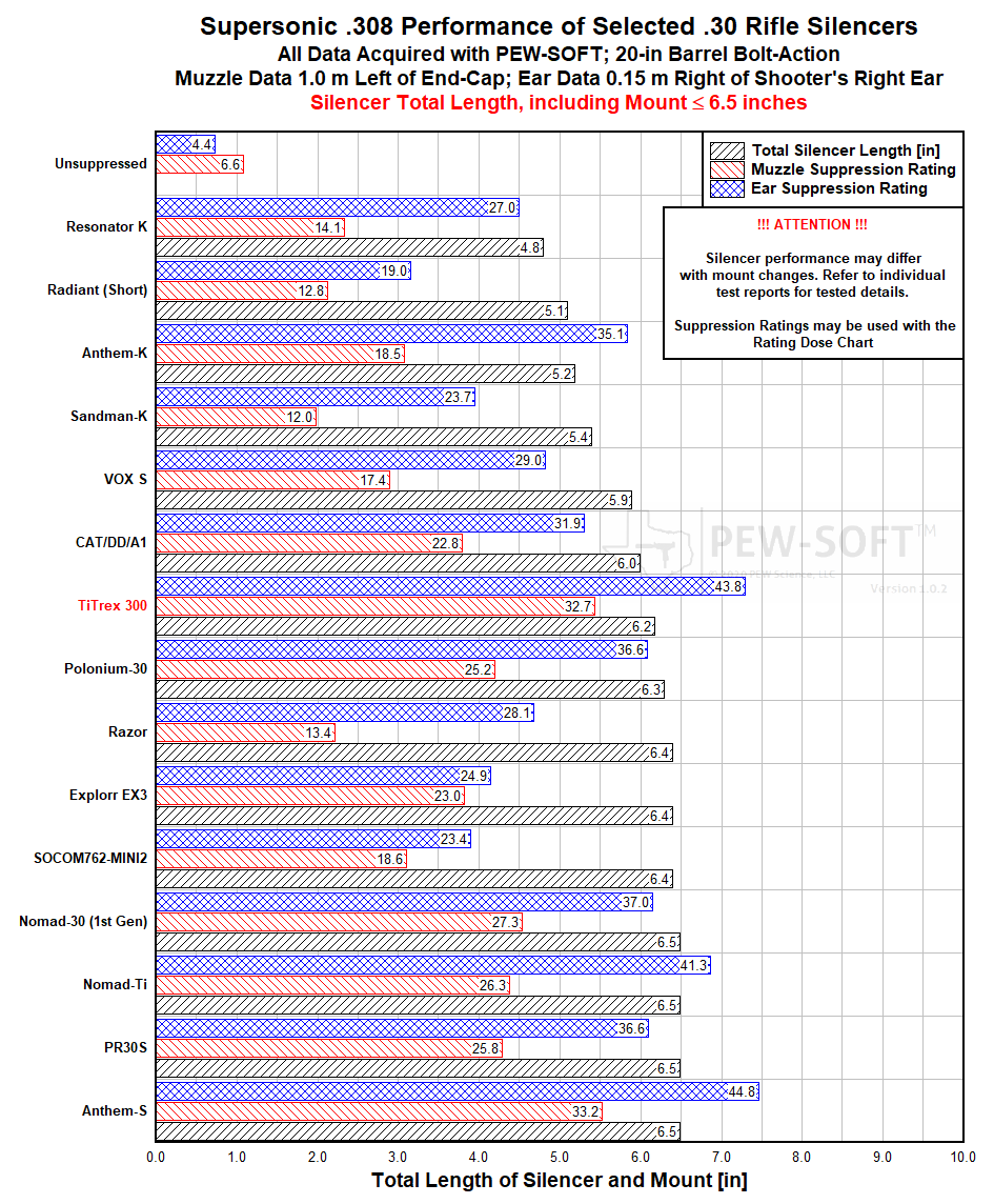 PEW Science Research Note 5: Examples of other silencers that are close performance competitors with the Precision Armament TiTrex 300 on the 308 bolt-action rifle in suppression performance include the aforementioned Anthem-S QD, along with the Silencer Central Banish 30 Gold (6.69), Boss Silencers Chairman (6.132), the FOR Monarch 7.62 (6.155), and others. Note that all of these silencers are longer than the TiTrex 300. The reader is encouraged to examine the sortable and filterable table in the Rankings Section of the Silencer Sound Standard and the member visualization tool which allows length and weight filtering. Further comparisons with silencers of similar length are provided later in this report.