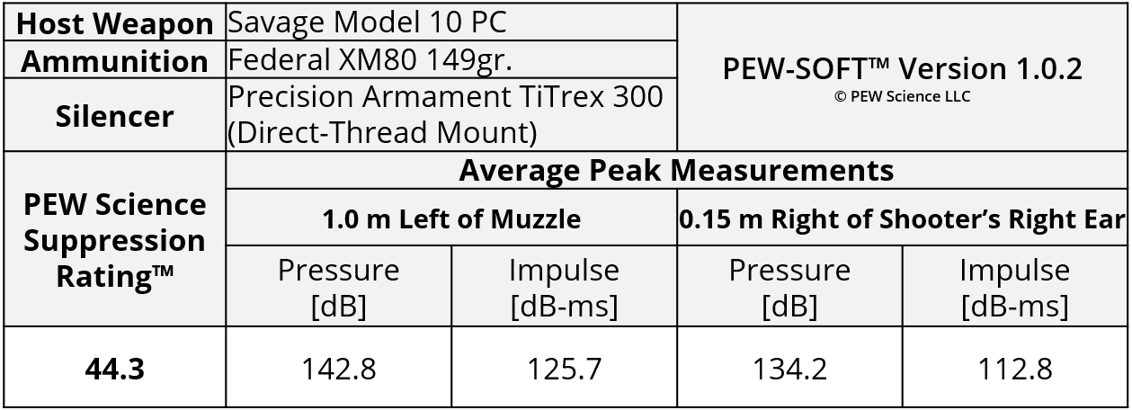 A summary of the principal Silencer Sound Standard performance metrics of the Precision Armament TiTrex 300 is shown in Table 1. The data acquired 1.0 m (39.4 in) left of the muzzle is available for viewing to all. This is a members-only review and includes pressure and impulse waveforms measured at the shooter’s ear. PEW Science thanks you for your support; further testing, research, and development of PEW-SOFT and the Silencer Sound Standard is made possible by members like you!