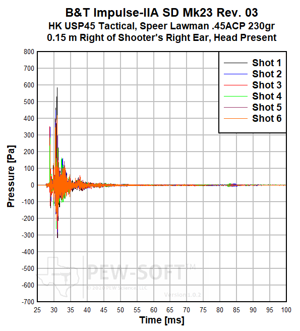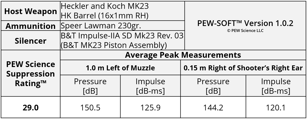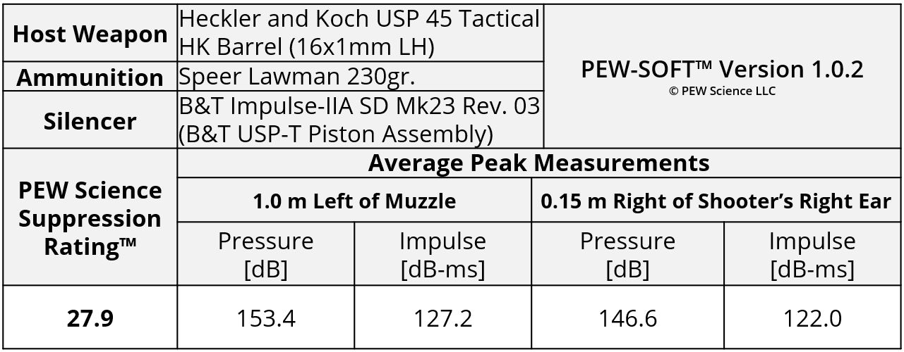 A summary of the principal Silencer Sound Standard performance metrics of the B&T Impulse-IIA SD Mk23 Rev. 03 tested on the HK USP45 Tactical is shown in Table 4. The data acquired 1.0 m (39.4 in) left of the muzzle is available for viewing to all. As stated in Section 6.214.4, this is a members-only review and includes pressure and impulse waveforms measured at the shooter’s ear. PEW Science thanks you for your support; further testing, research, and development of PEW-SOFT and the Silencer Sound Standard is made possible by members like you!