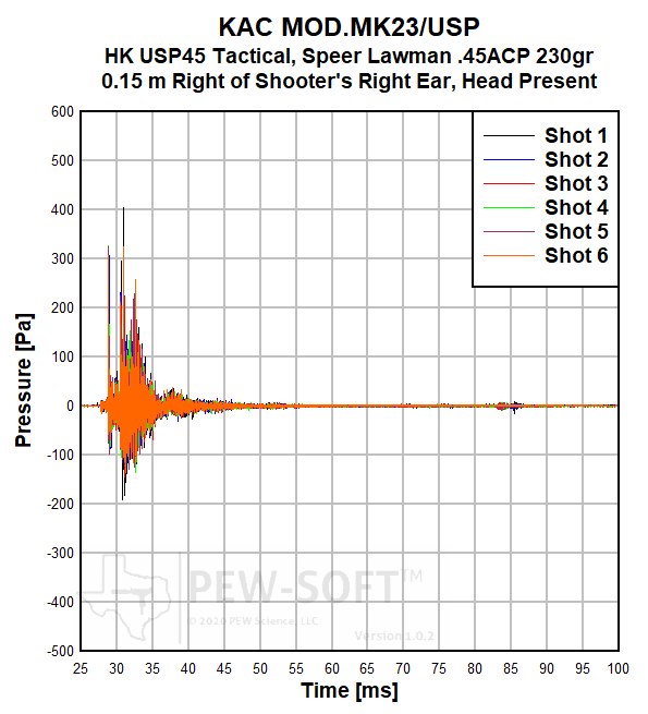 Real sound pressure histories from the same 6-shot test of the KAC MOD.MK23/USP on the MK23 acquired with PEW-SOFT at the shooter’s ear are shown below. Again, the waveforms are not averaged, decimated, or filtered. The data acquisition rate used in all PEW Science testing is 1.0 MS/s (1 MHz).