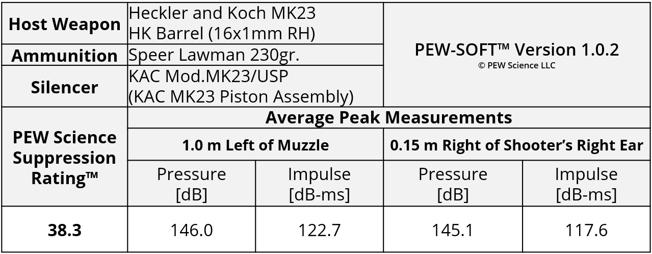 A summary of the principal Silencer Sound Standard performance metrics of the KAC MOD.MK23/USP tested on the HK MK23 is shown in Table 1. The data acquired 1.0 m (39.4 in) left of the muzzle is available for viewing to all. This is a members-only review and includes pressure and impulse waveforms measured at the shooter’s ear. PEW Science thanks you for your support; further testing, research, and development of PEW-SOFT and the Silencer Sound Standard is made possible by members like you!