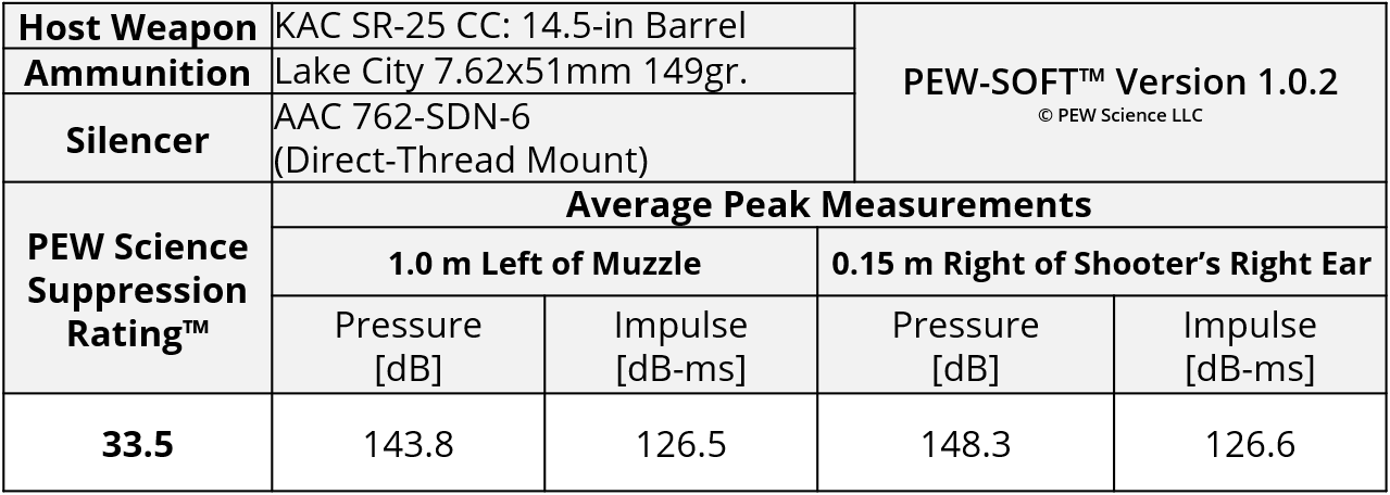 PEW Science Research Note 10: Note that the muzzle Suppression Rating of the AAC 762-SDN-6 is 32.9 and the at-ear Suppression Rating is 22.4; different zones on the Suppression Rating Dose Chart. In the tested configuration, the blast loads from the tested weapon system are significantly suppressed, but not suppressed enough for a human to forgo the use of hearing protection, for most use operator use cases. However, use of the AAC 762-SDN-6 silencer on the SR-25, when compared to firing the SR-25 unsuppressed, may significantly reduce the risk of blast overpressure injuries, such as traumatic brain injury (TBI), particularly near reflecting surfaces.