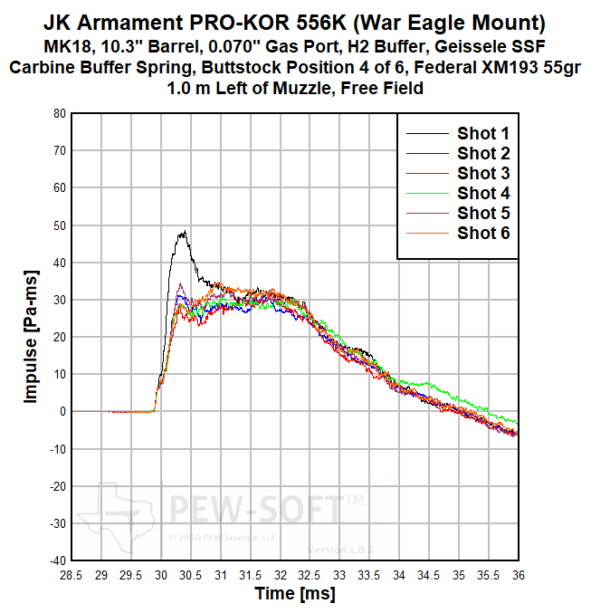 In this review, the JK Armament PRO-KOR 556K performance metrics depend upon suppressing a supersonic centerfire rifle cartridge on a short barrel gas-operated rifle, which is an incredibly difficult task. PEW Science encourages the reader to remain vigilant with regard to all supersonic centerfire rifle suppression claims. The gas volume and combustion products created by the firing of the supersonic 5.56x45mm cartridge are significant; the measured pressure and impulse magnitudes, and their durations, illustrate this fact. Silencer performance on automatic (reciprocating) rifles depends on many factors. Weapon configuration may significantly influence total suppressed small arm system performance.